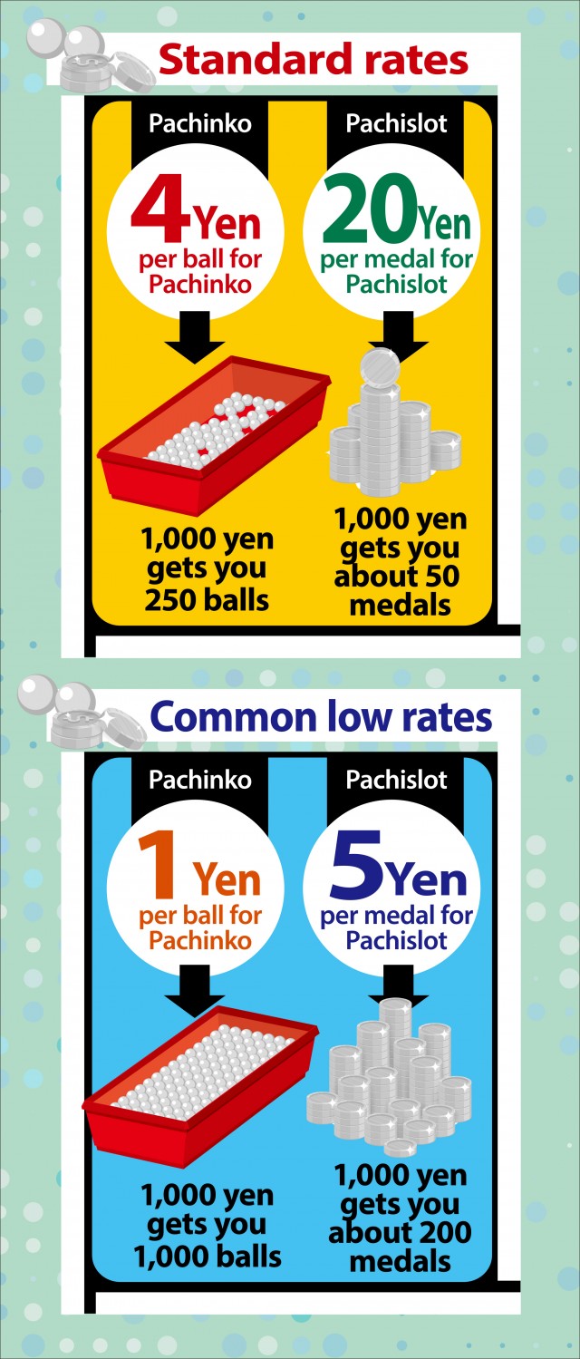 There are mainly two rate types: "4yen pachinko" and "1yen pachinko". These differ in standard rates each pachinko ball.