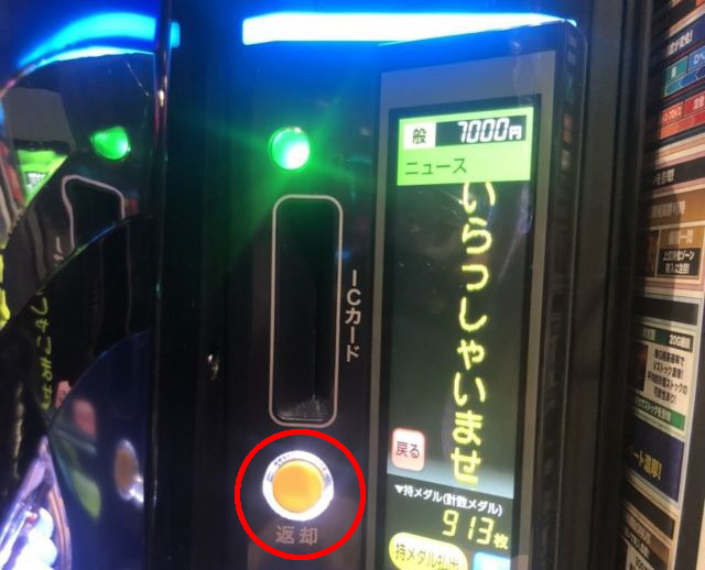 When you finish playing, any remaining money inserted into the machine Sand can be retrieved by pressing the "返却" = "refund" button, which will dispense a card holding the balance. (If the machine has an integrated medal counter, both the remaining money and any medals won will be dispensed.)