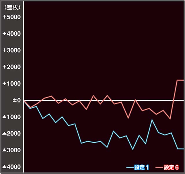 続いてスランプグラフを見ていきましょう。今回は設定1と6の2本データを取りましたので見比べてみると、設定6は序盤中盤とモミモミ状態が長かったですが終盤で大きな出玉を掴みプラス領域にしっかり浮上して終了。