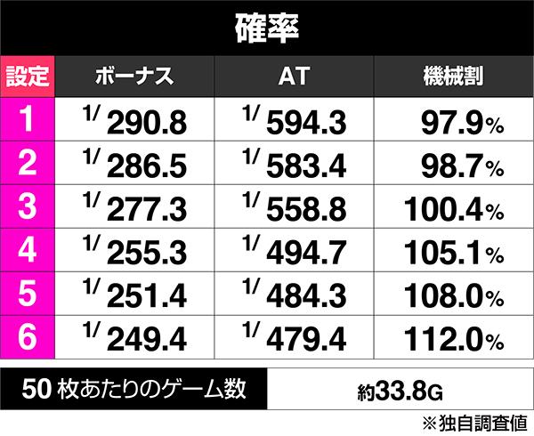 ボーナスに比べると、AT初当り確率は1/479.4〜1/594.3と、少し大きめに差がついているので、設定推測の際にはAT確率の方が重要になりそうです。