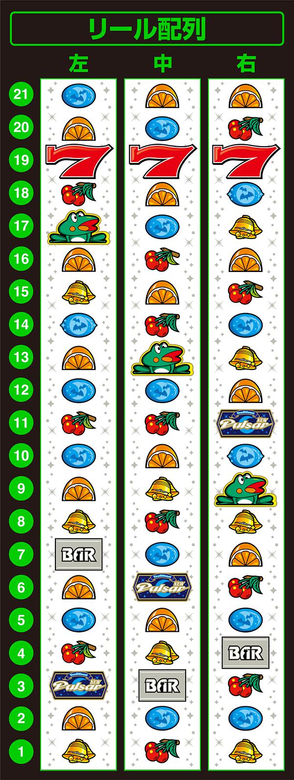 コチラは各リールにカエル図柄を狙えばOK。REGだった場合でも右リールのカエル付近にBAR図柄があるので「カエル・カエル・BAR」が揃ってREGがスタートするので問題ないぞ。