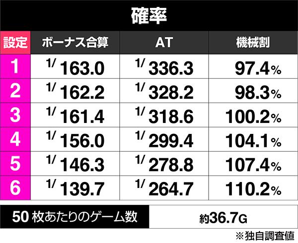 機械割自体はそれほど高くないのだが、高設定域だと他の「リアルボーナス+AT」タイプの機種の中ではボーナス確率が高い。