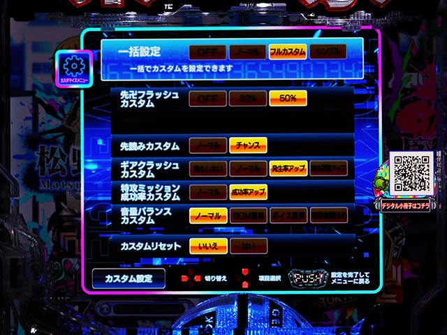サミー恒例の高信頼度デバイス振動アクションの大当り占有率をカスタムで選択可能。
