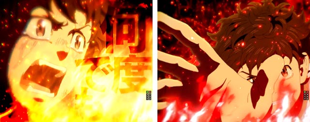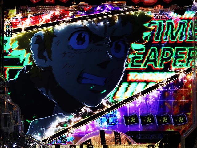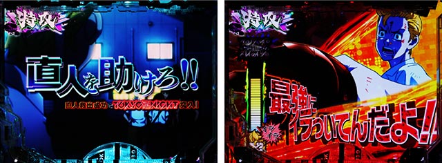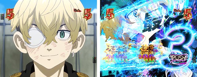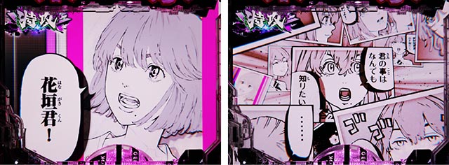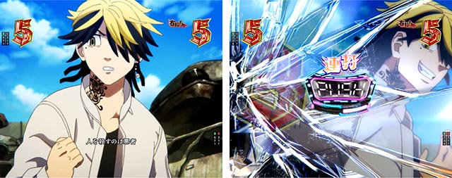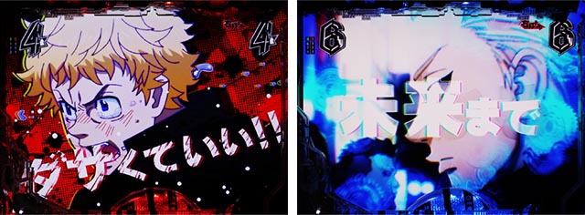 タケミチの顔アップカットから、「助ける」のセリフを放てば連続予告に。テンパイ成立まで続き、継続時の文字が赤や金になれば信頼度が高まる。タケミチの姿(現在or過去)やあおり時キャラ(マイキー・ヒナ)も要チェックだ。