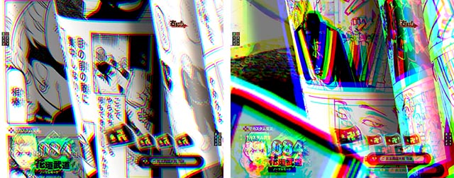 リーチ成立までの変動中盤・終盤に色の境目がボケて画面がブレているように感じるアクション。その時間が長いほど信頼度が高い。