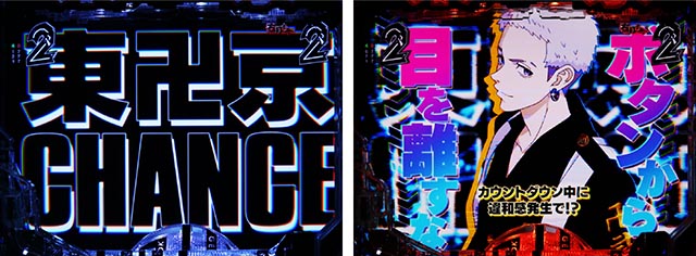 トータル信頼度が高い連続予告。西暦の数字が浮かび上がれば4つのストーリーが進行するが、それがドラケン&マイキーか卍會結成なら鬼アツ。ボタンアイコン変化や継続時の赤文字は図柄揃いの実現度がより高まる。