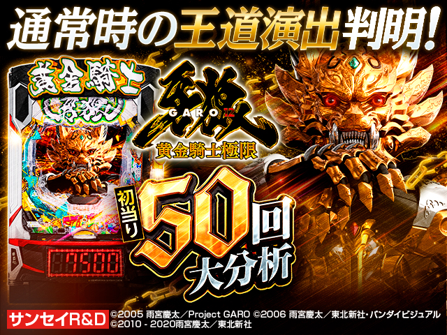 サンセイR&D初のLT3.0プラス対応機『e牙狼12黄金騎士極限』が、ついにホールに登場した。通常時液晶図柄揃い確率は1/437.49で、液晶図柄揃い時の50%で極限7500バトルに突入。極限7500バトルは1回転の即連仕様で、ラウンド中のバトルに勝利すると7500個+LTに突入する。LTも即連タイプで継続率は約76%、大当りの25%が7500個となっている。