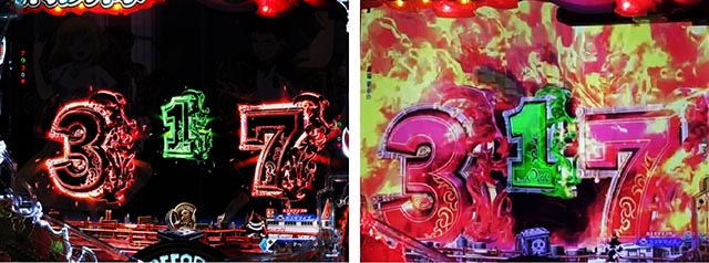 通常時のV-フラッシュは、発生すれば大当りにくわえてRUSH突入が濃厚となる。ONにすれば大当り占有率がアップするぞ。炎上バトルモード中のV-フラッシュは超炎上BURST濃厚で、ONにすることで大当り占有率を大幅に上げることができる。