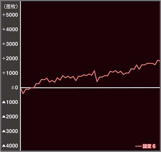 そして今回実戦した設定6のスランプグラフです。AT機のようにタイミング次第でうんぬんということはなくボーナスさえ引いていればこのように上昇していきます。