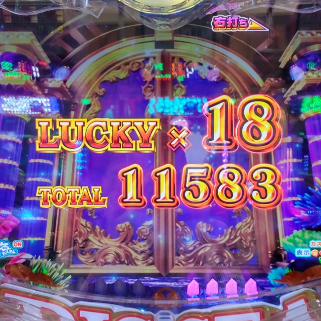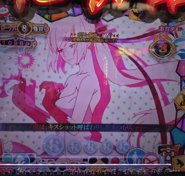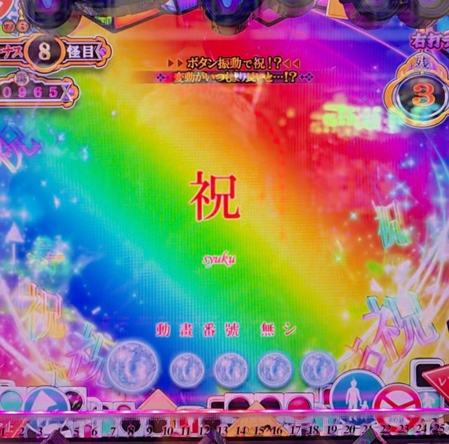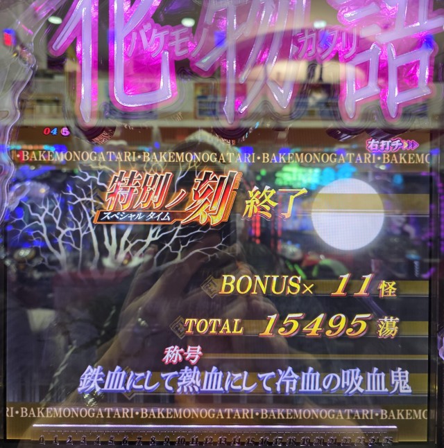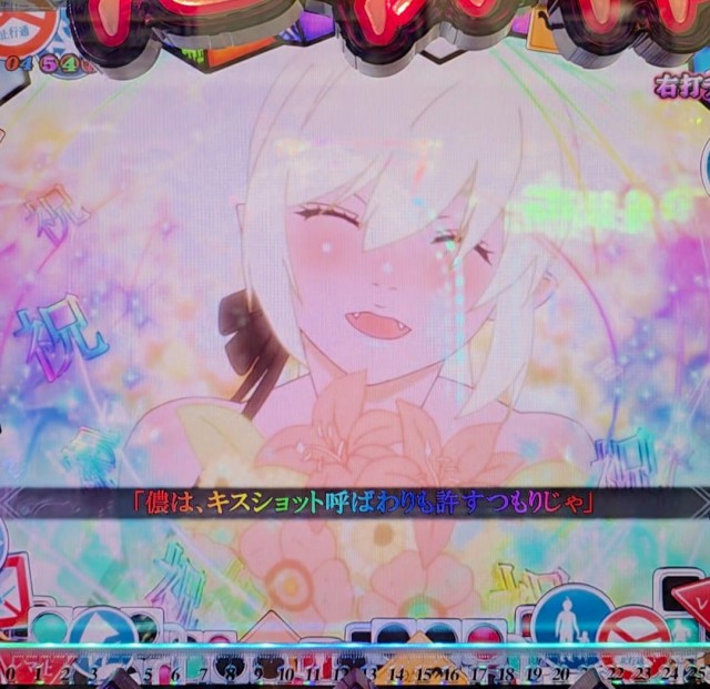 『P化物語 319ver.』にて、ST終了間近のキスショット演出発生中に虹テロップ予告、もちろん虹・祝カットインから祝福のキスショット大当り、最終的に一撃15000発超えゲットの大勝利ですねん!
