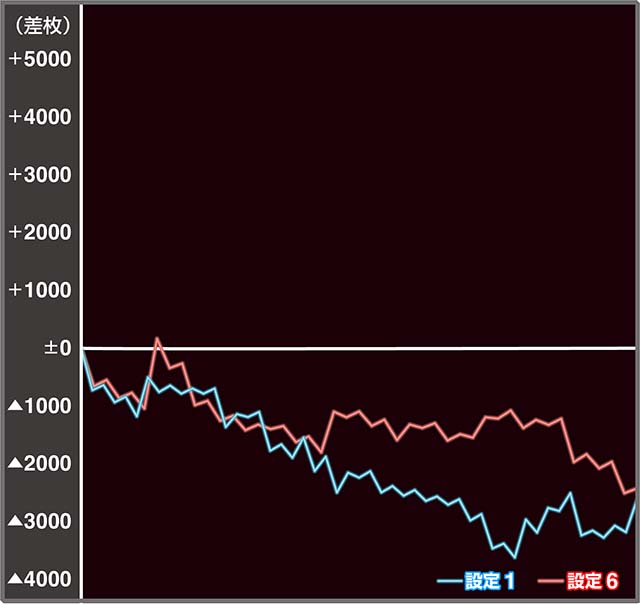 今回は設定1・6を採取。そのスランプグラフになりますが、どちらも下のほうに振れてしまいました。