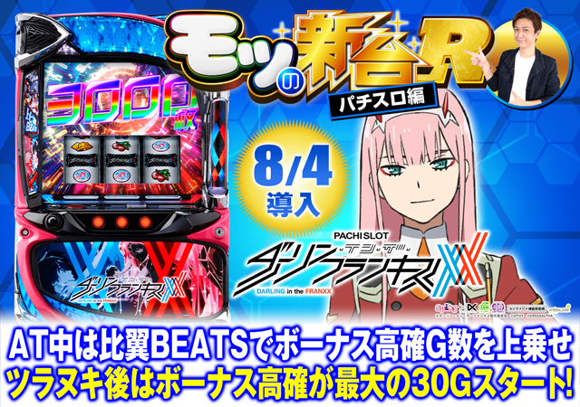 通常時もAT中も即決着で爽快感高まる『L ダーリン・イン・ザ・フランキス』は8月4日(月)より、全国のホールに導入開始。ボーナス高確ゲーム数をMAXまでブチ上げた時の破壊力は一級品。入替初日からグラフを右肩上がりに爆伸ばししちゃってください!