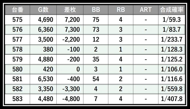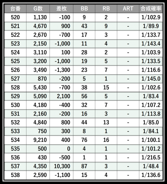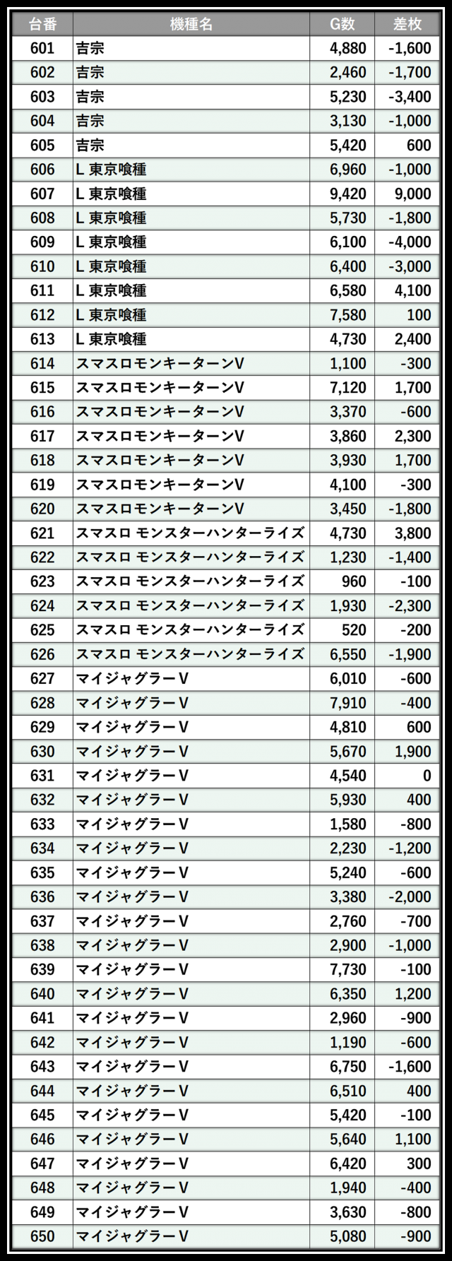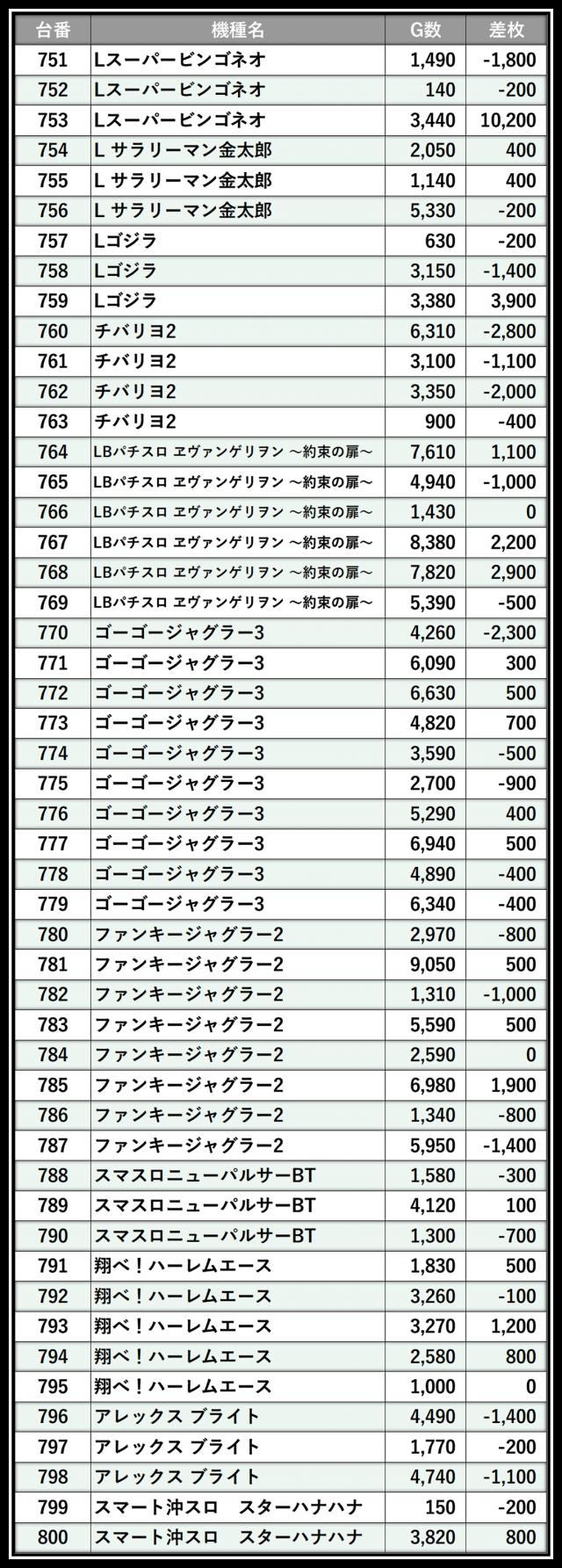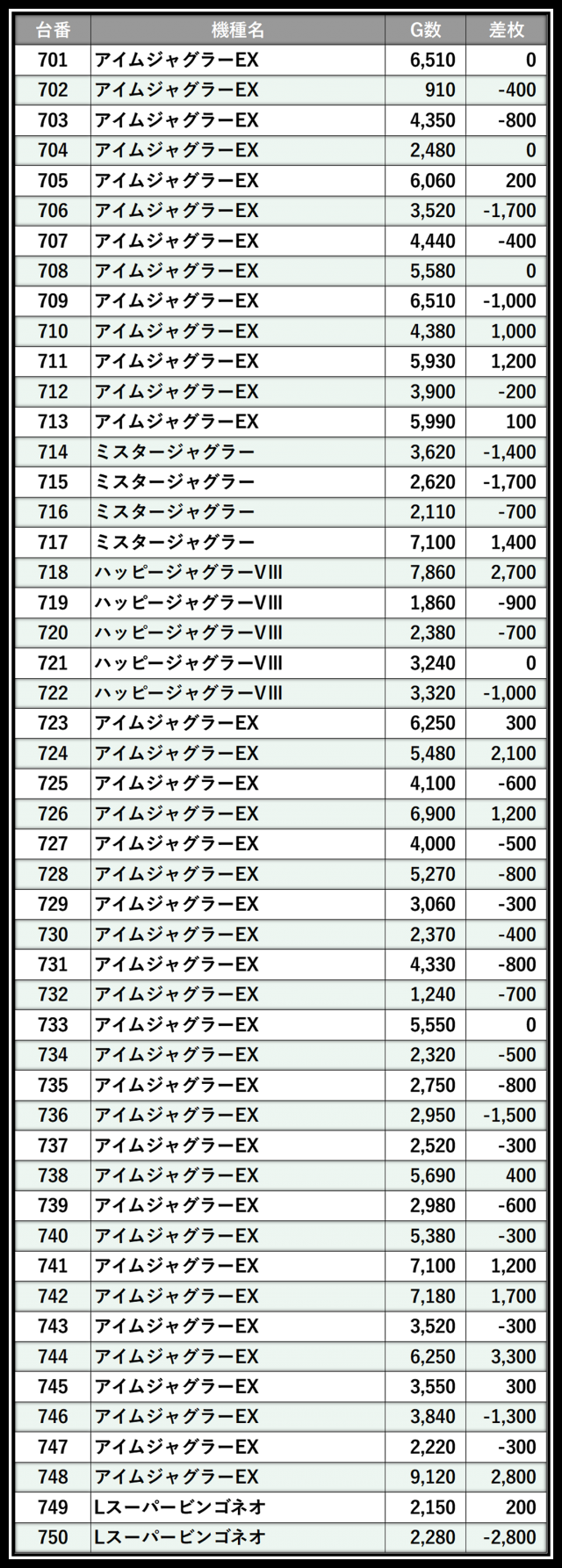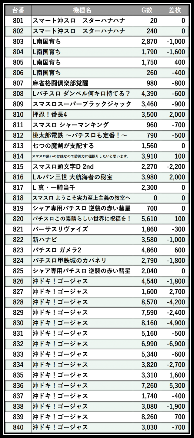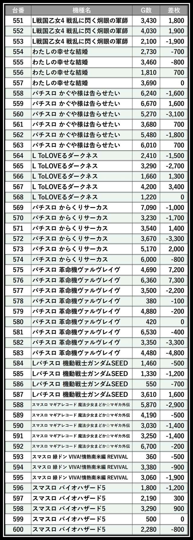 ※差枚数順に掲載しています