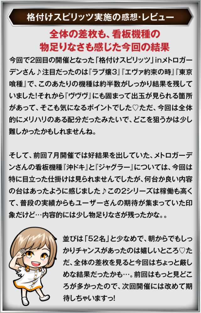 8月3日(日) メトロガーデンにて、DMMぱちタウンの「格付けスピリッツ」を実施。