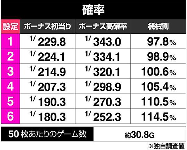 ボーナス初当り・ボーナス高確率ともに高設定ほど確率が高い。ボーナスは比較的当たりやすいので、短いスパンでは高設定か否かの判断がしにくい機種と言える。