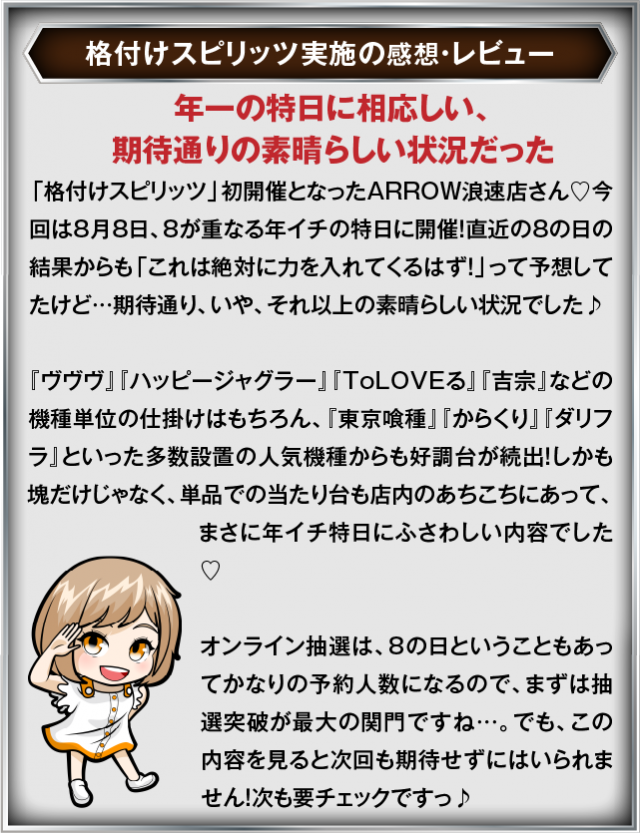 8月8日(金) ARROW浪速店にて、DMMぱちタウンの「格付けスピリッツ」を実施。