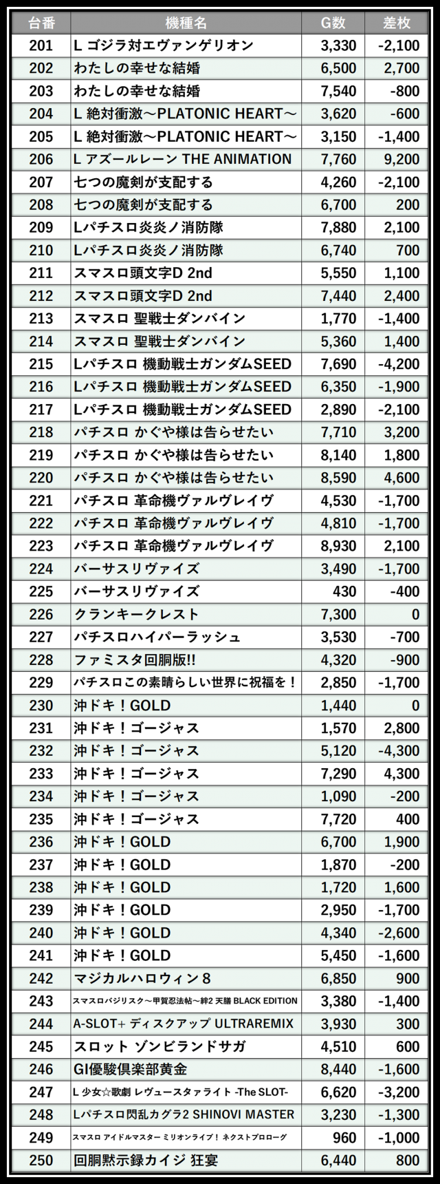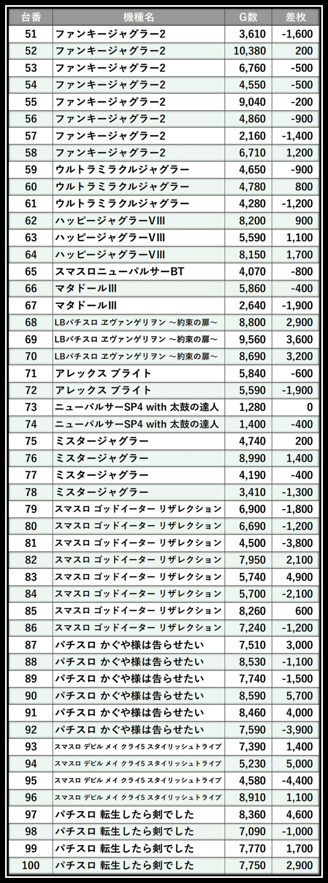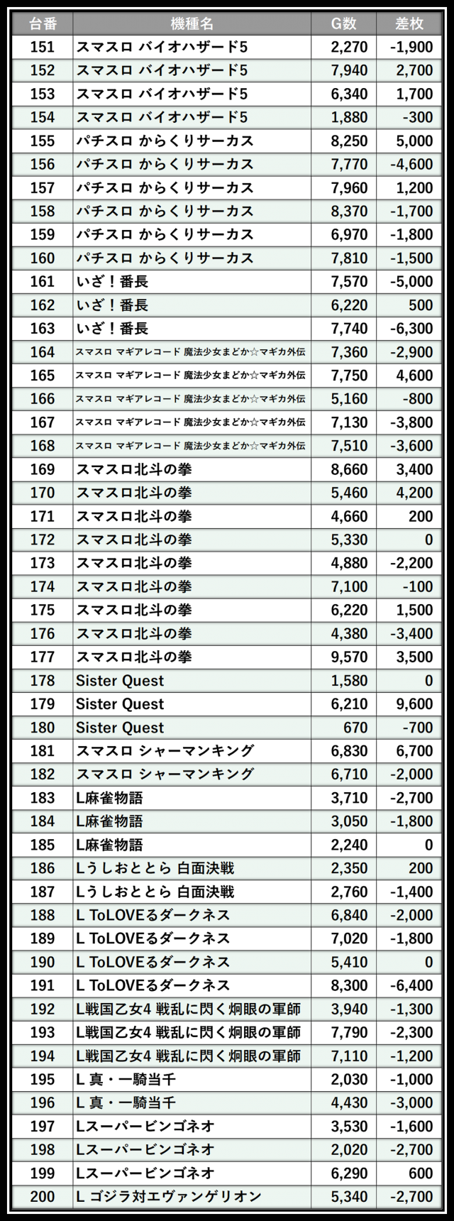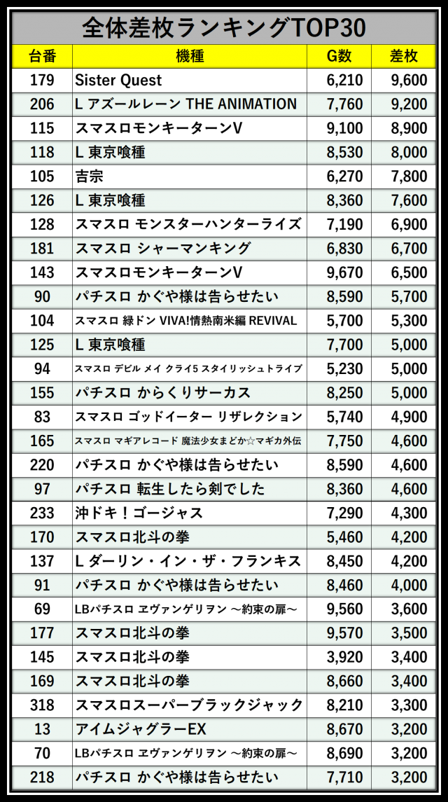 ※差枚数順に掲載しています