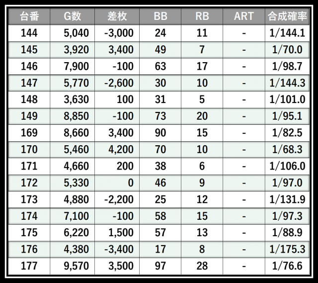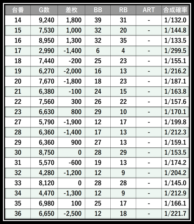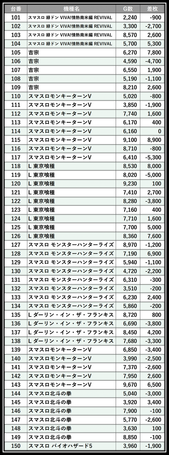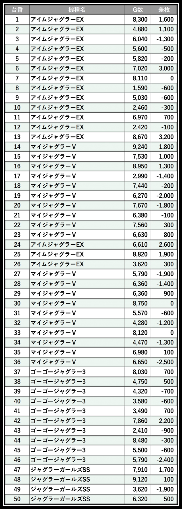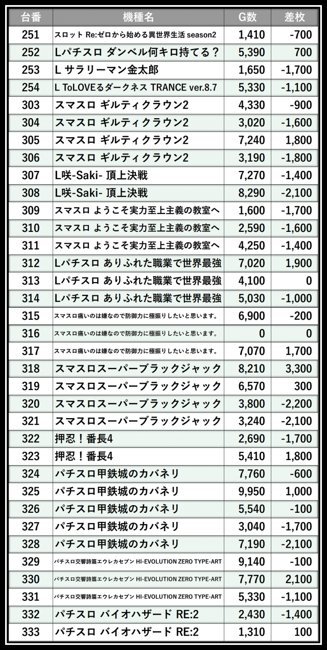 ※差枚数順に掲載しています