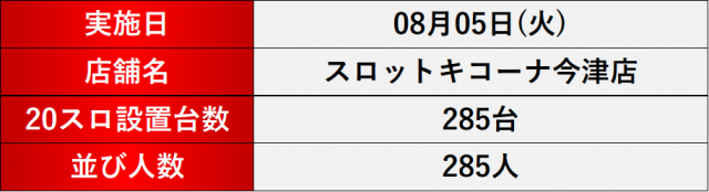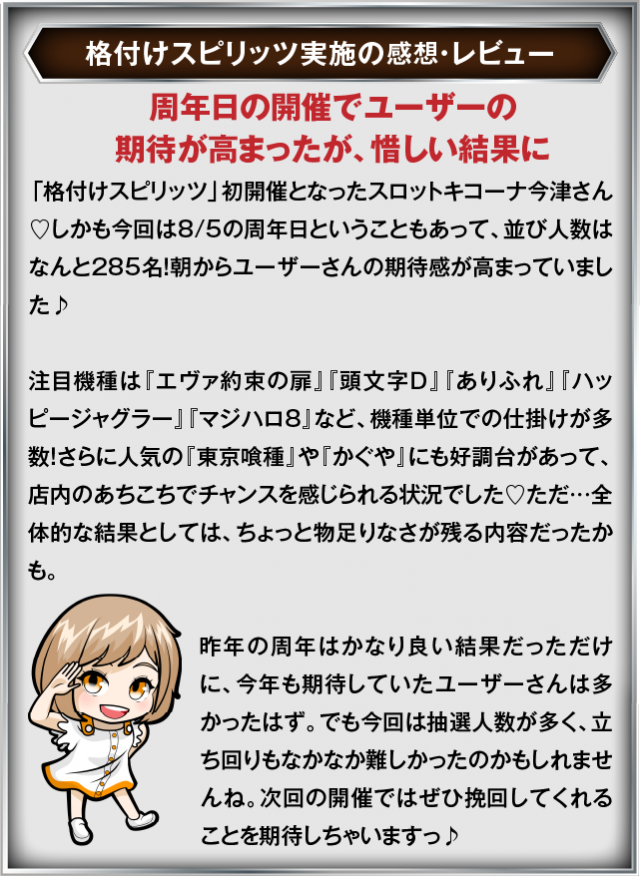8月5日(火) スロットキコーナ今津店にて、DMMぱちタウンの「格付けスピリッツ」を実施。