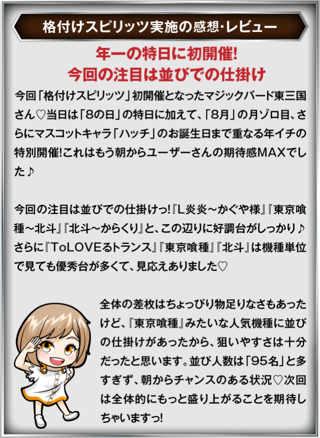8月8日(金) マジックバード東三国にて、DMMぱちタウンの「格付けスピリッツ」を実施。
