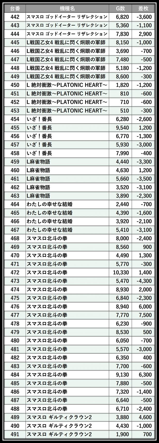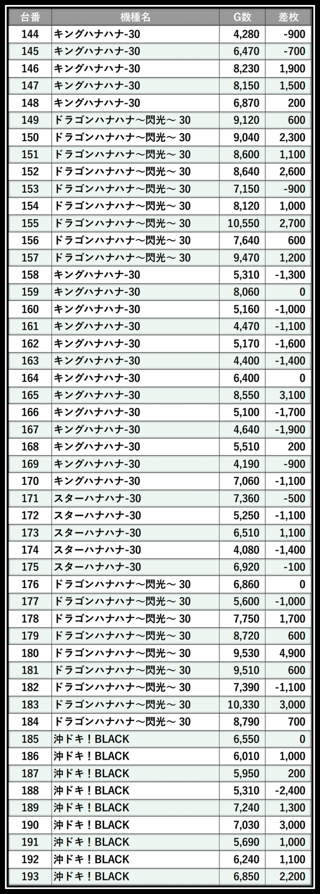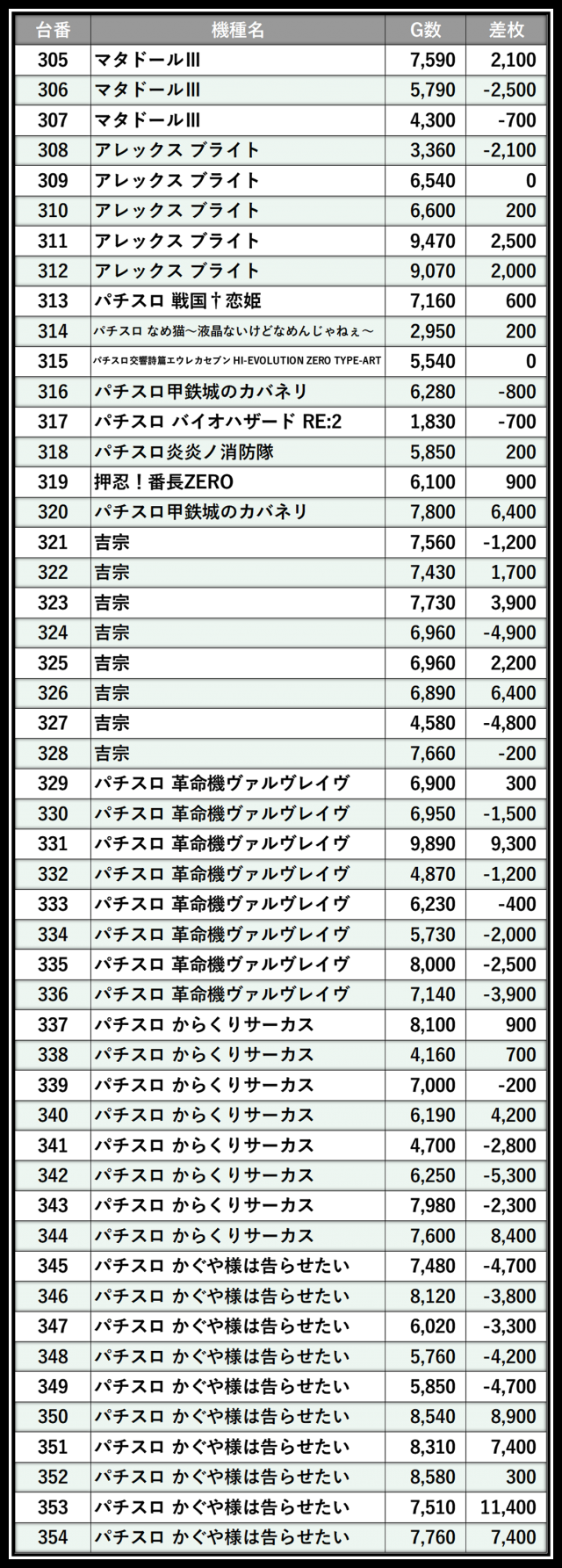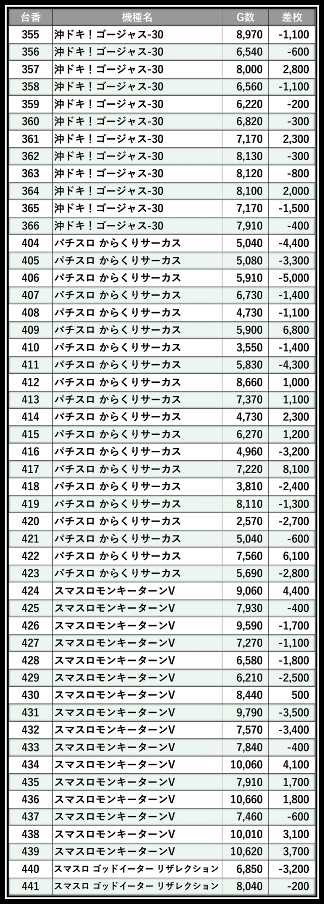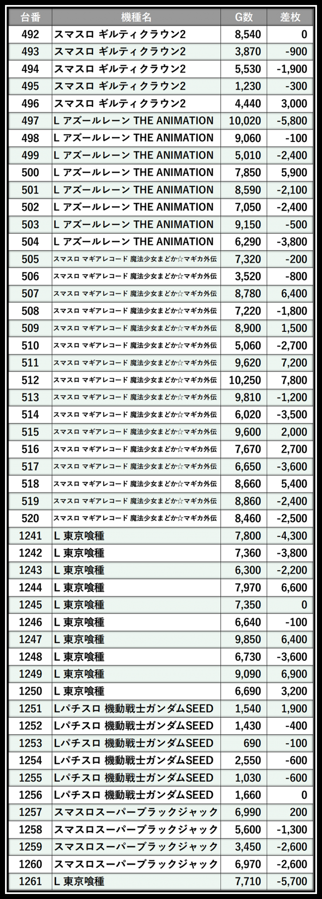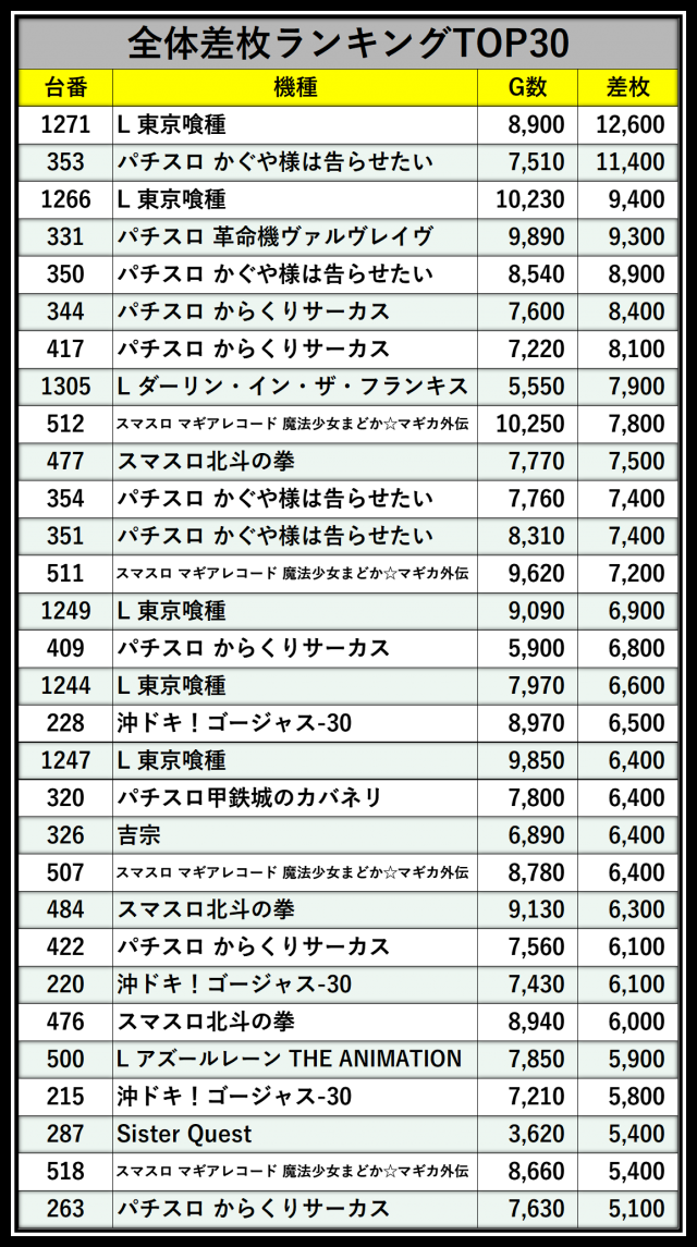 ※差枚数順に掲載しています