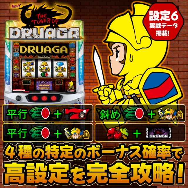 あと、本機の特徴として完全攻略で設定1でも機械割100%を超えるという目押し力がモノをいう機種で、BIGの最終ゲームにあるビタ押しポイントとその後のDC(ドルアーガチャレンジ)で、いかにメインATであるDG(ドルアーガゲーム)のゲーム数を稼げるかがポイントになっています。