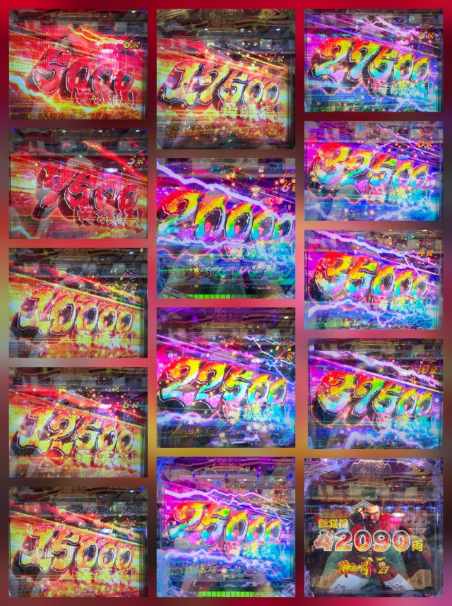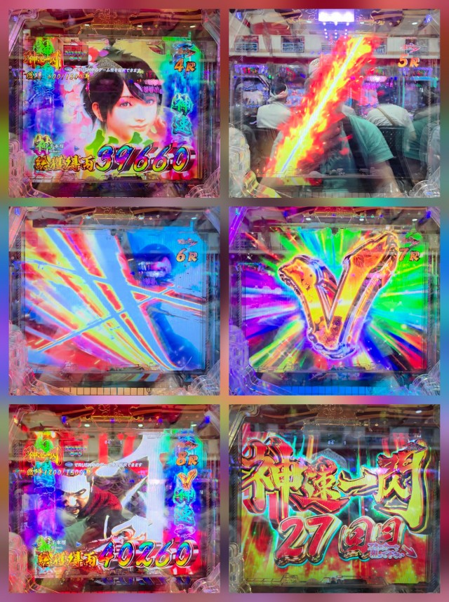『真・座頭市物語』にて、通常時に虹フラッシュで虹テロップから大当り、蝋燭チャレンジ失敗と思いきやおたね登場で復活ST。その後ラッキートリガーにも突入し最終的に一撃27連42000発超えをゲットですねん!