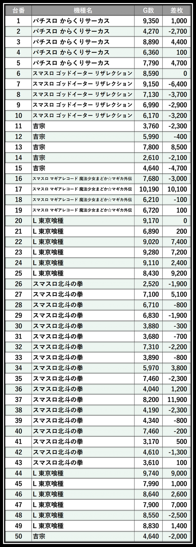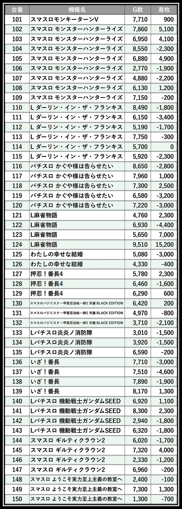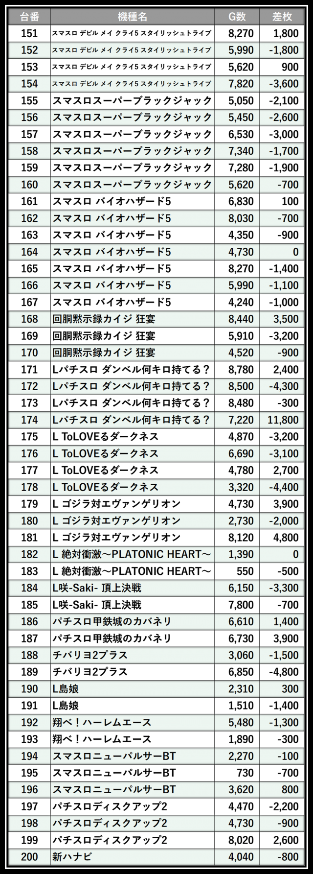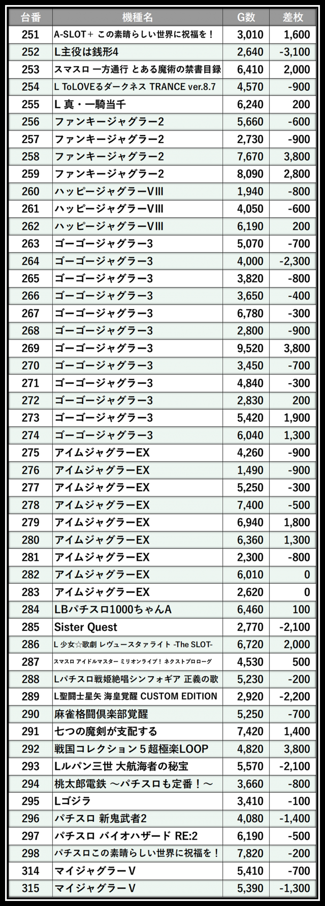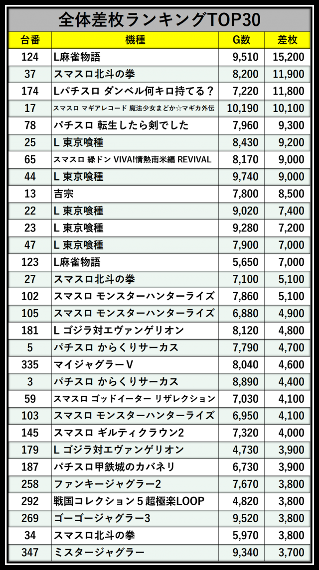 ※差枚数順に掲載しています