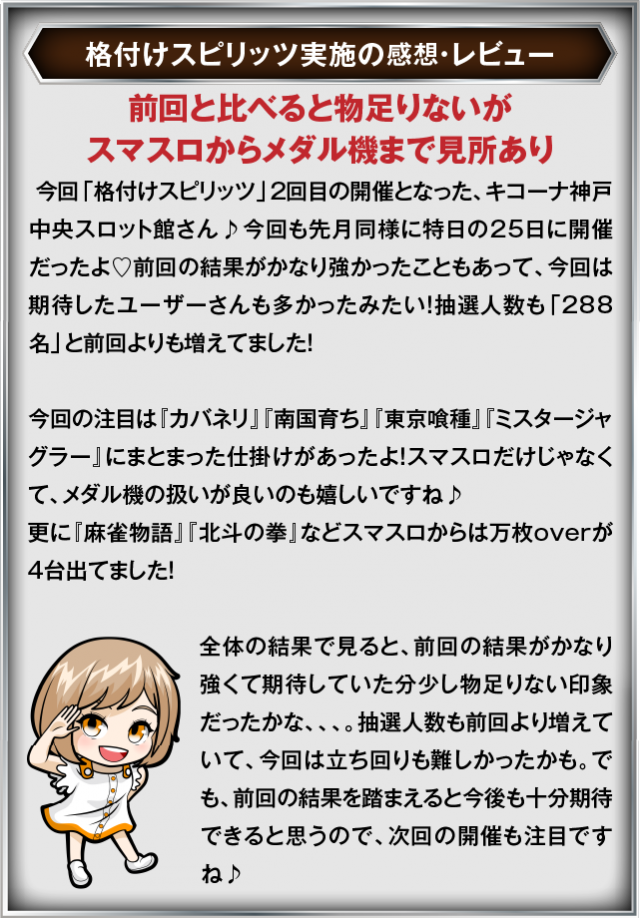 8月25日(月) キコーナ神戸中央スロット館にて、DMMぱちタウンの「格付けスピリッツ」を実施。