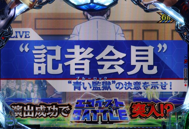 リーチハズレ後のあおり成功から、こちらの大当りが発生する可能性があります。記者会見がひらかれるので、そこで決意を示せればLT突入です。