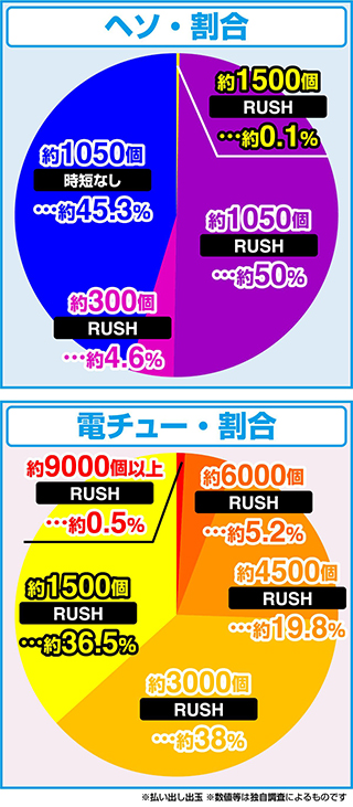 ※ヘソの割合は1500個大当り、1050個大当り、300個RUSH突入の合算割合