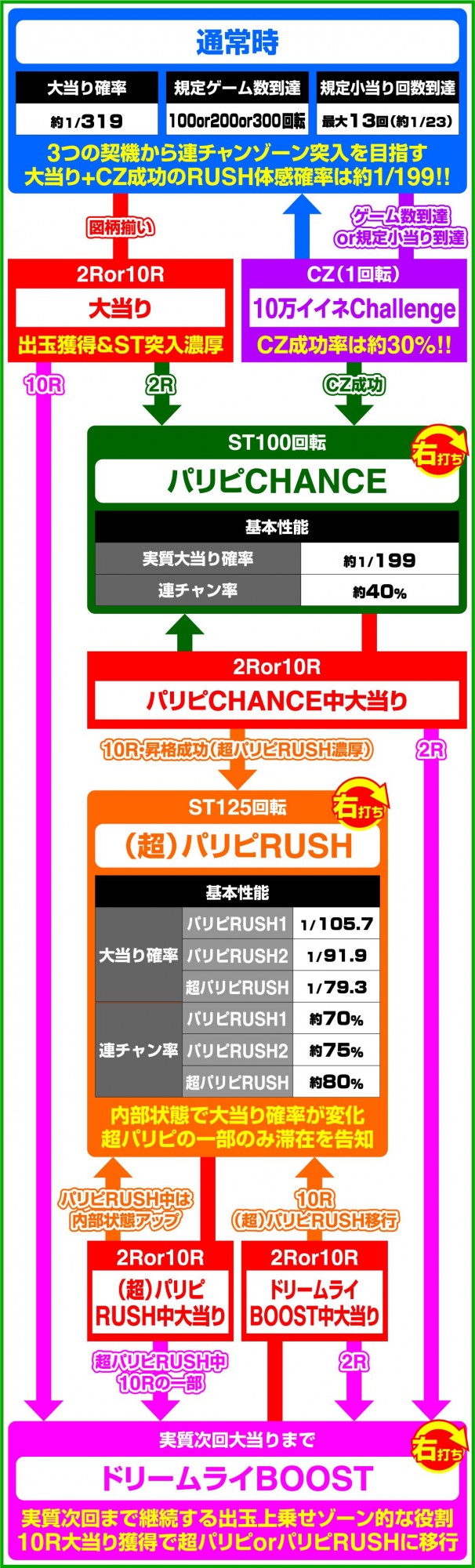 本機の通常時の図柄揃いは、いわゆるミドルスペック並みの大当り確率。その後は1%が本機最高形となる出玉上乗せモードのドリームライBOOSTへ、99%は右打ち100回転のパリピCHANCEに突入する。