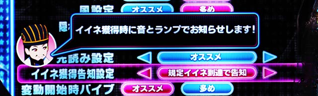 カスタム設定は2つで、どちらも玉がヘソチャッカーに入賞した際に「イイネ」ボイスが聞こえると、小当り発生の合図。「イイネ獲得時に告知」はすべての小当りで、「規定イイネ到達で告知」は規定小当り回数に達したときに生じる。