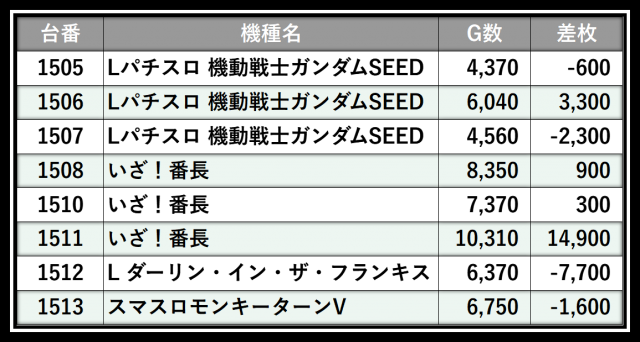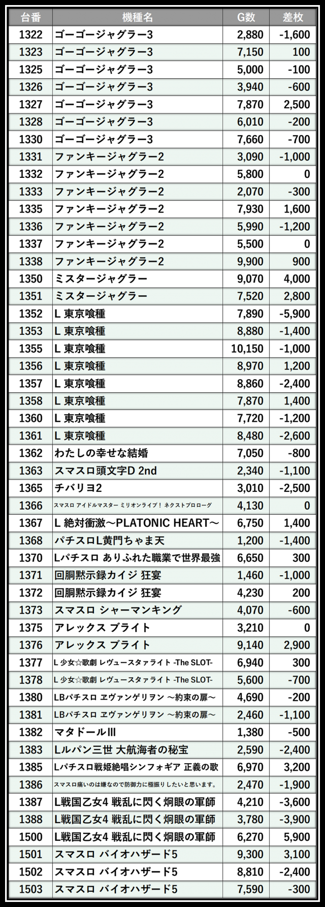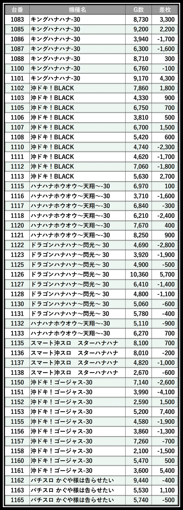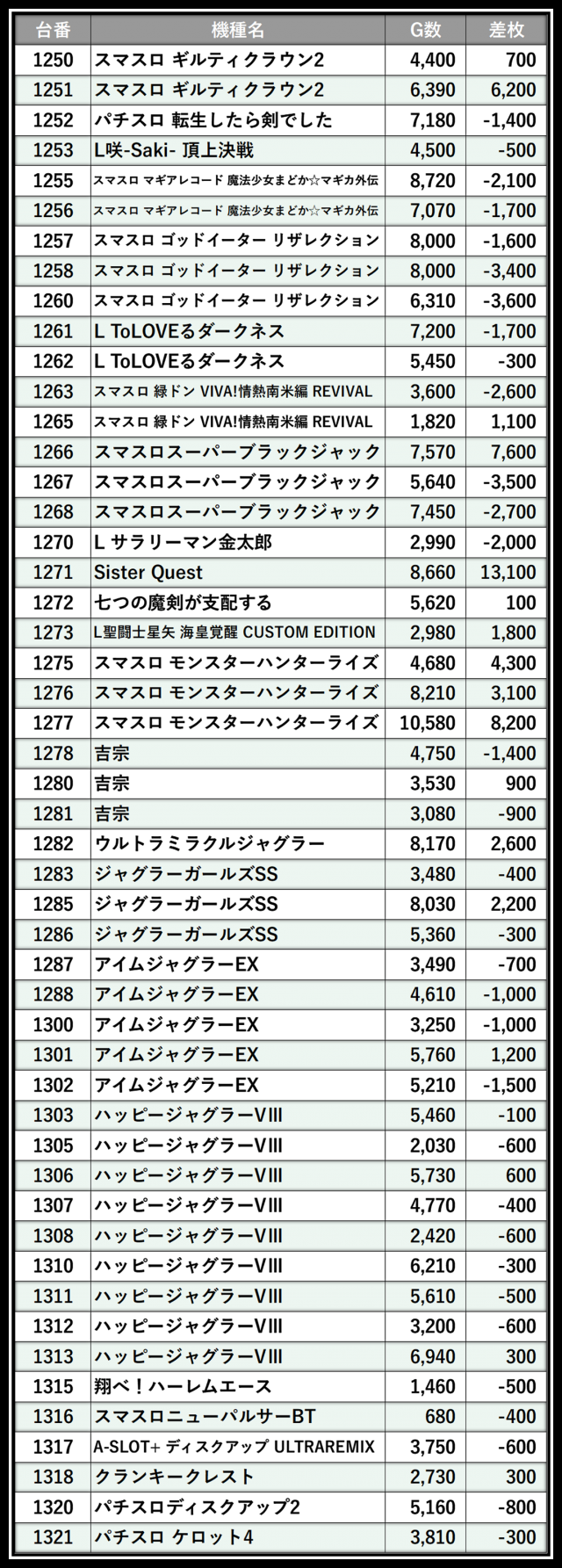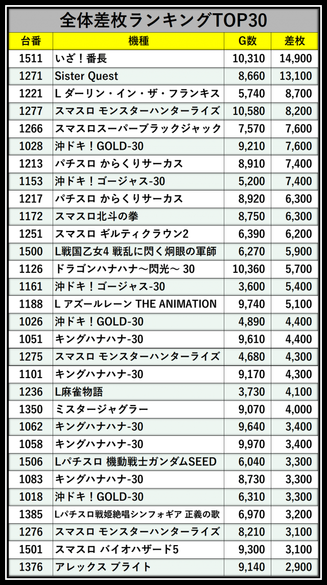 ※差枚数順に掲載しています