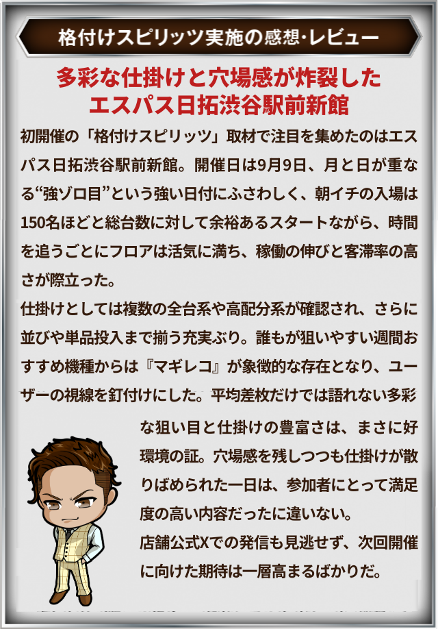 9月9日(火)エスパス日拓渋谷駅前新館にて、DMMぱちタウンの「格付けスピリッツ」を実施。