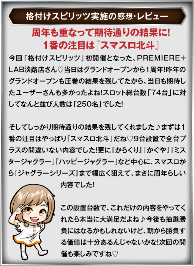 9月13日(土) PREMIERE+LAB淡路店にて、DMMぱちタウンの「格付けスピリッツ」を実施。