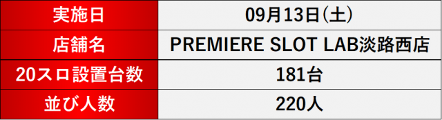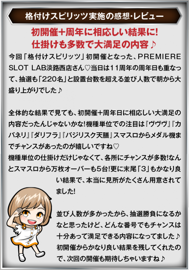 9月13日(土) PREMIERE SLOT LAB 淡路西店にて、DMMぱちタウンの「格付けスピリッツ」を実施。