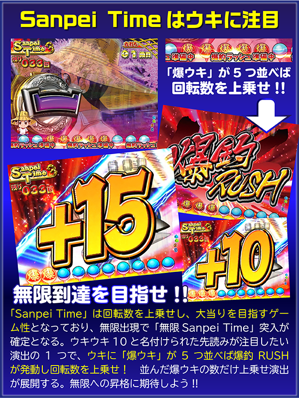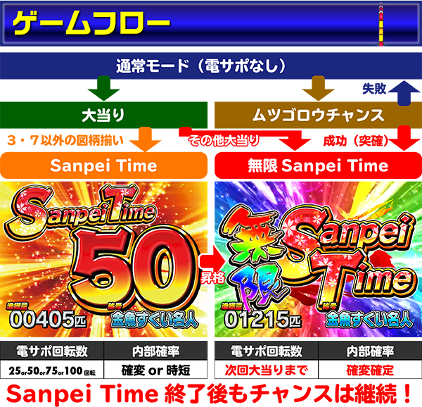 大当り後は必ず電サポが付き、無限Sanpei Timeならば次回大当りまで電サポが継続。