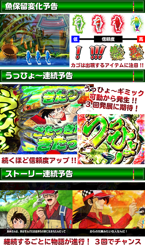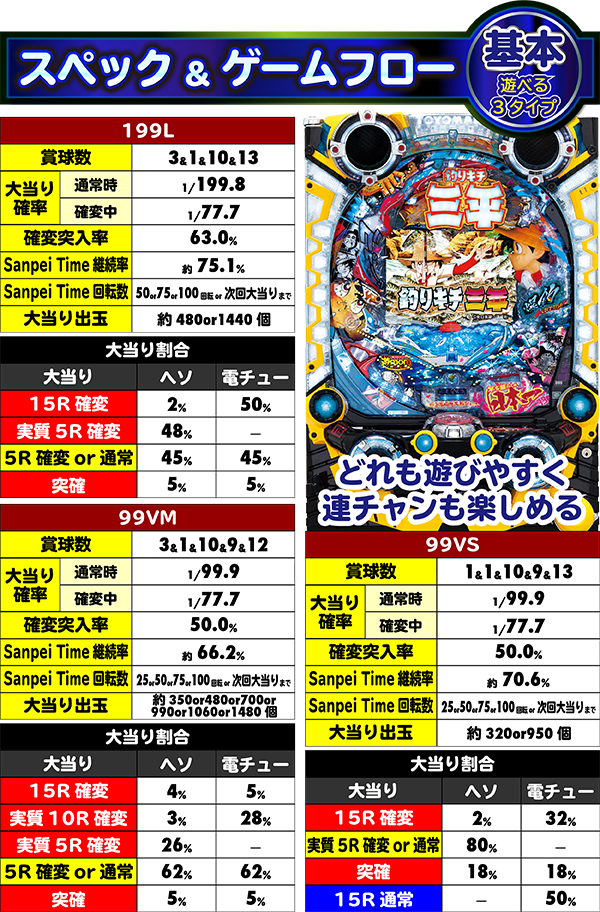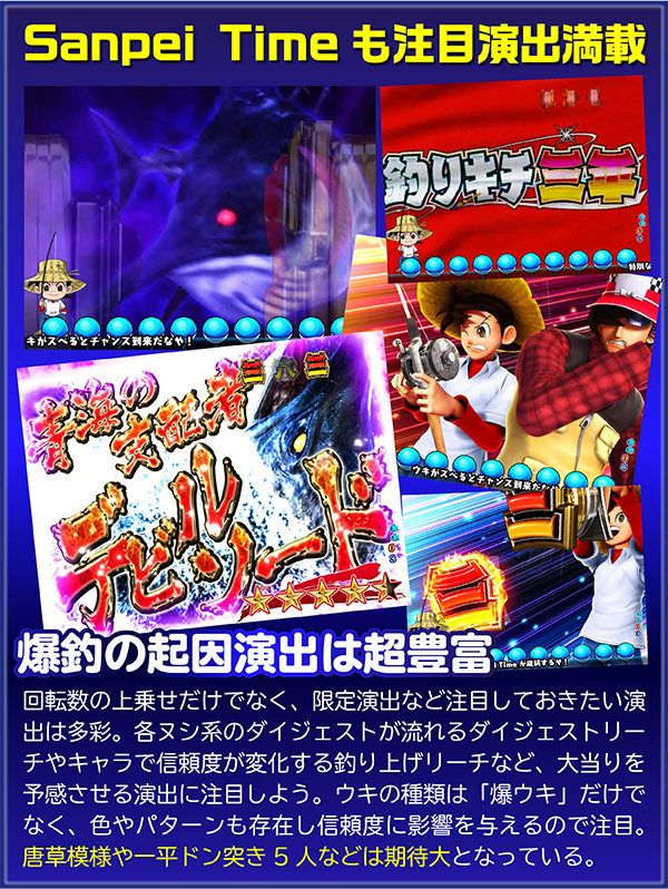 ここでは基本スペックから通常時の注目演出まで、爆釣へとつながるポイントを徹底追及。ホールにて大物を釣り上げるために熟読して頂きたい。