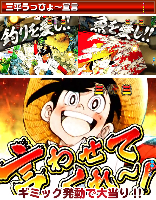 三平の宣言の後にボタンをプッシュし、ギミックが発動すれば大当りとなる。