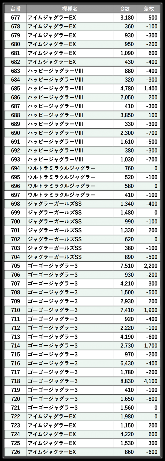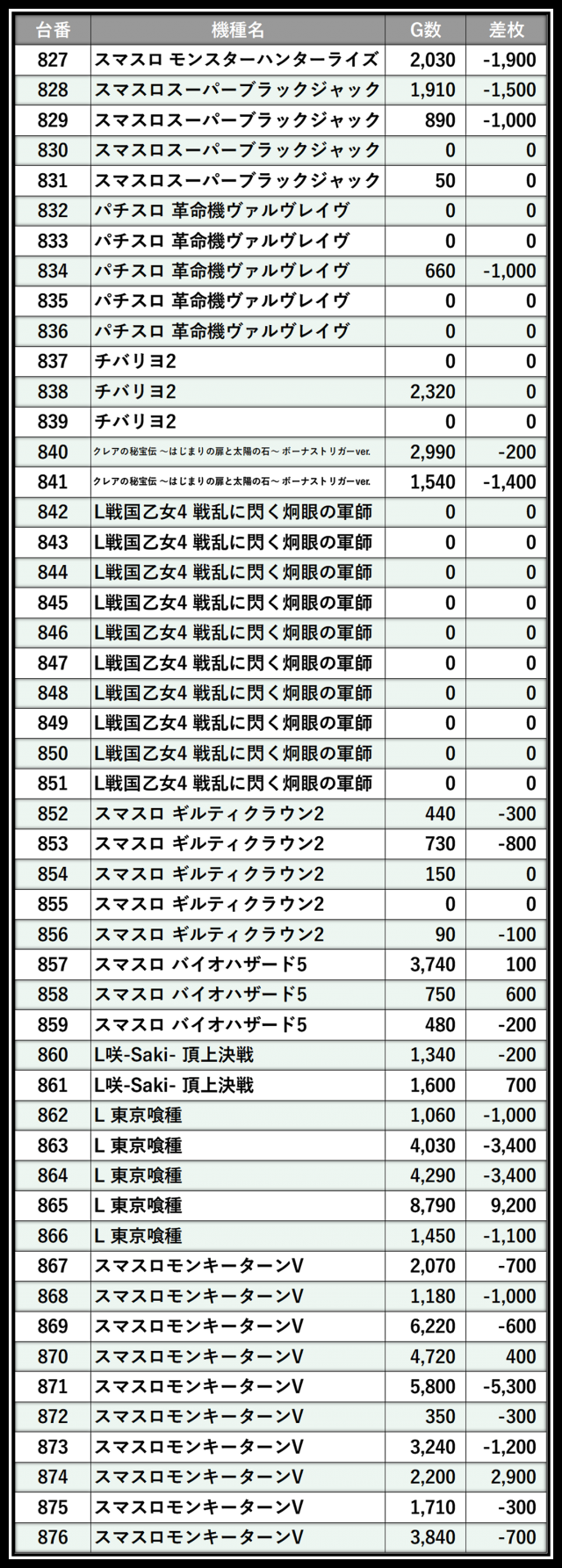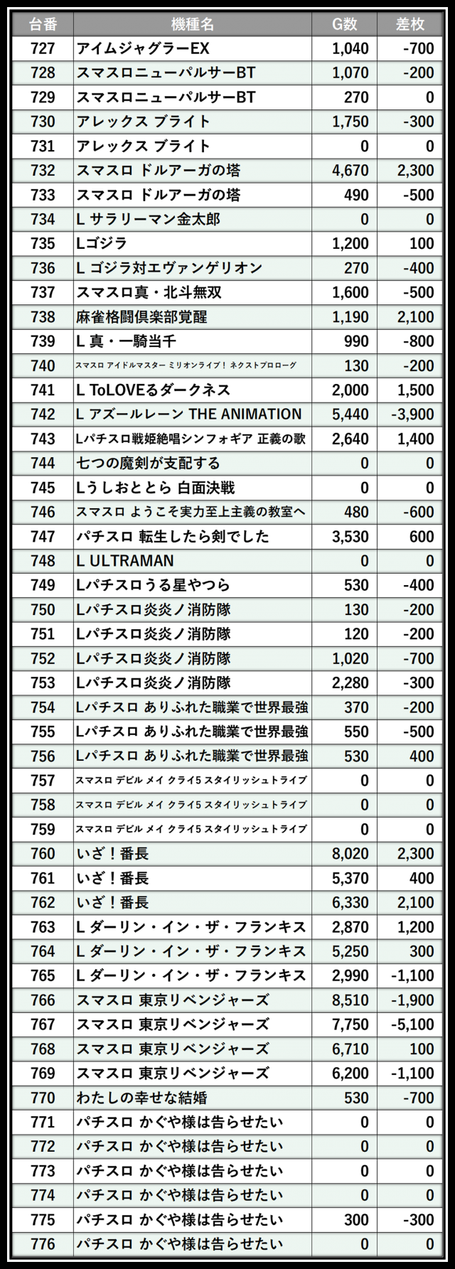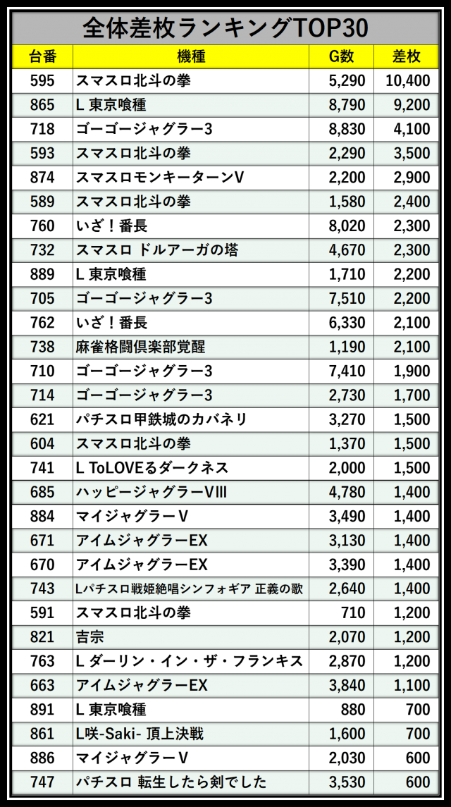 ※差枚数順に掲載しています