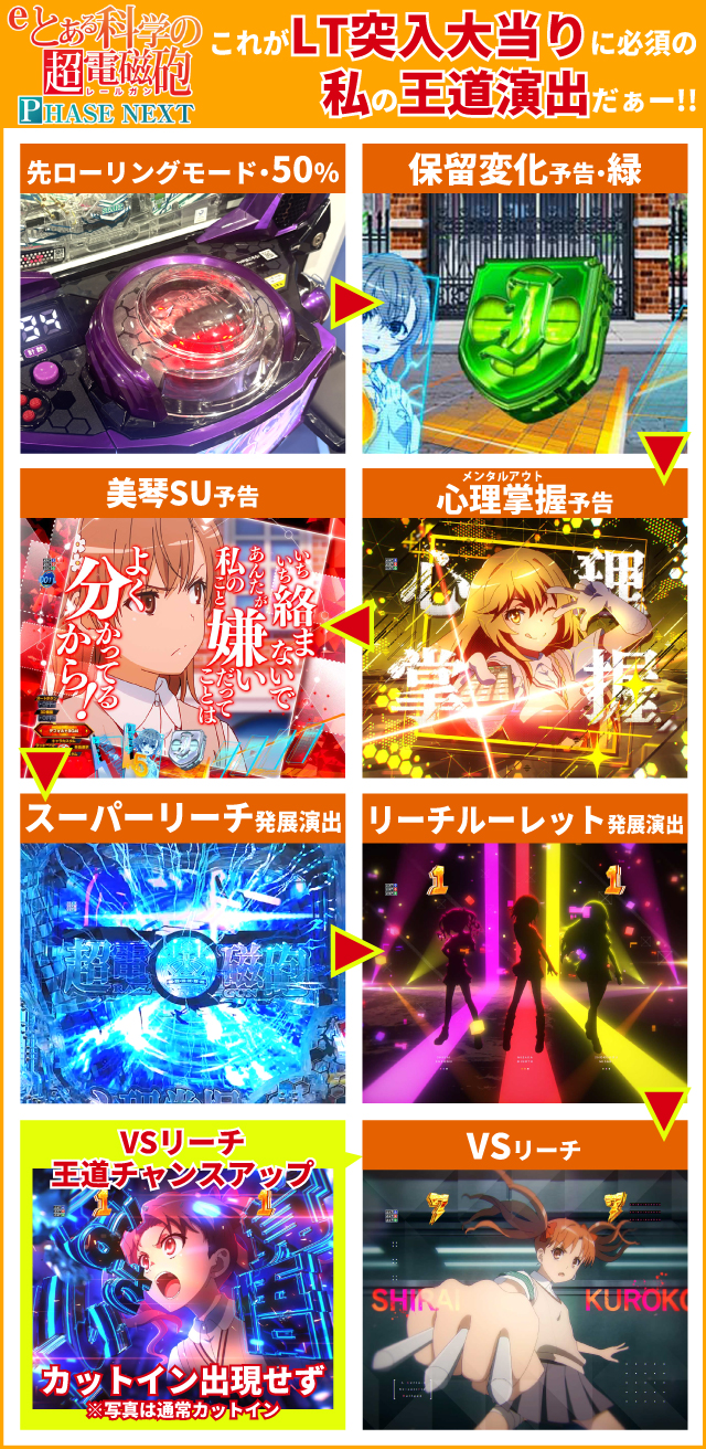 最初にカスタムで先ローリングモード・50%を選択した場合は、発生は欠かせない。先読み系では保留変化予告・緑以上を待ちつつ、当該では心理掌握(メンタルアウト)予告や美琴SU予告を経てテンパイへと向かう。リーチ後はスーパーリーチ発展演出やリーチルーレット発展演出を契機にVSリーチへと進み、大当り濃厚のカットインが出現しないパターンになれば大当り、そしてLT突入目前だ!