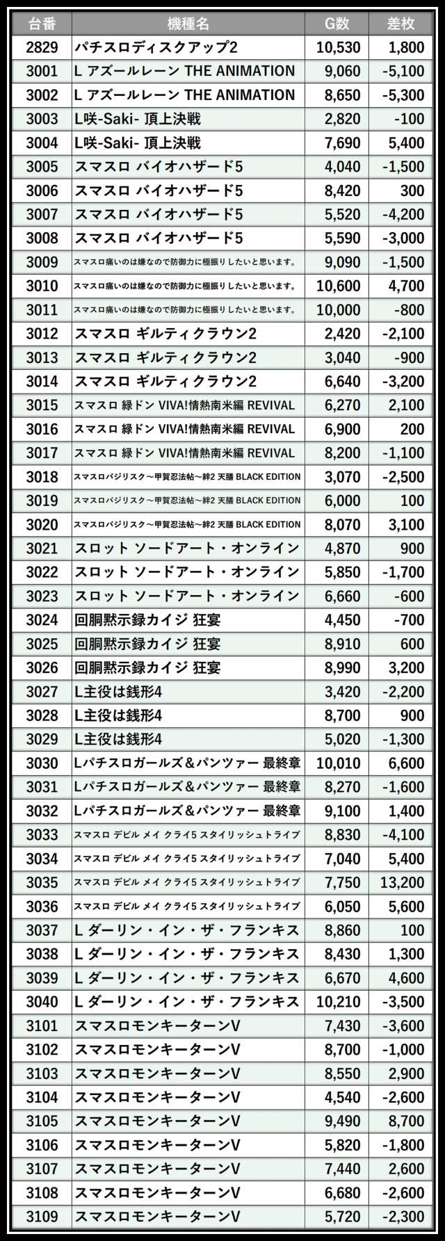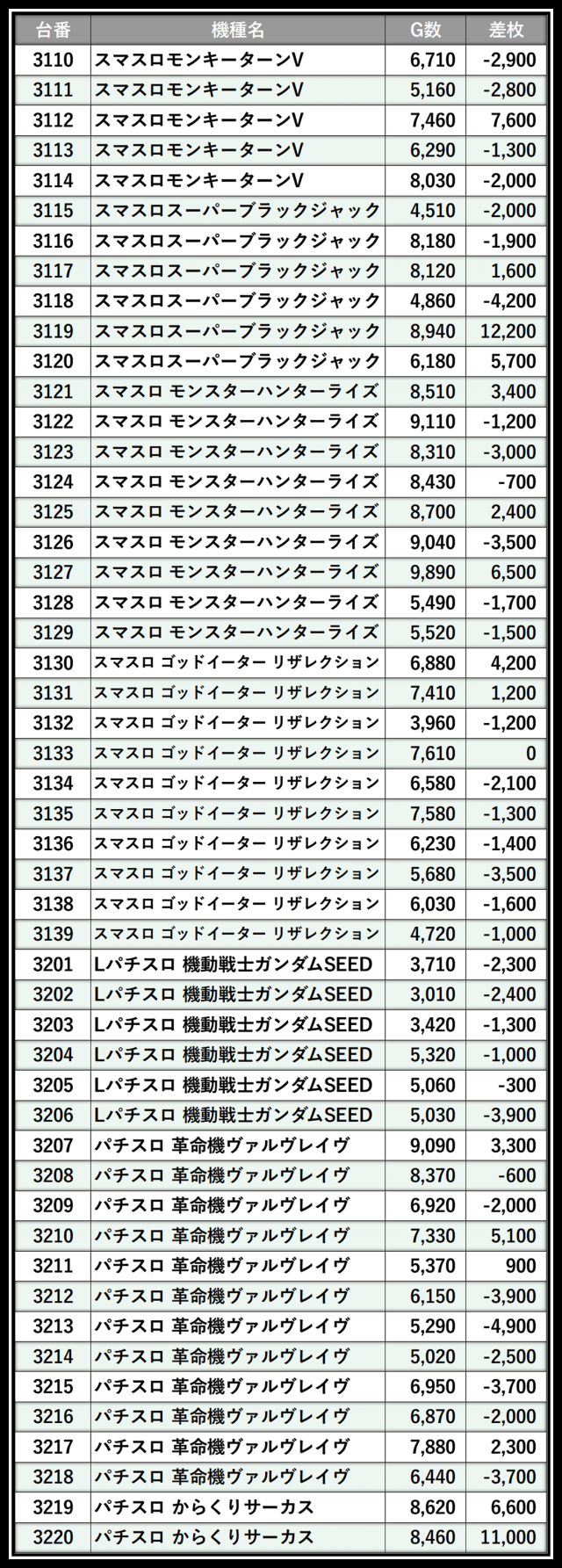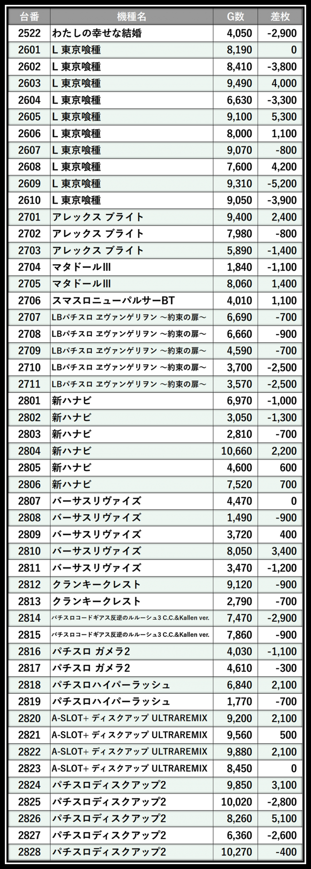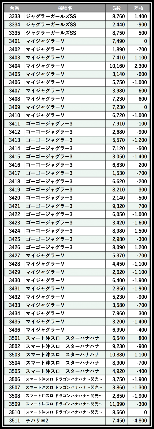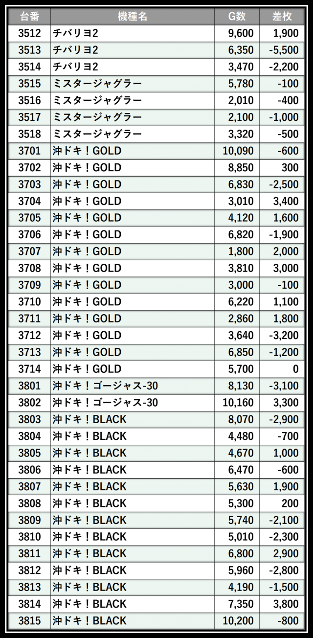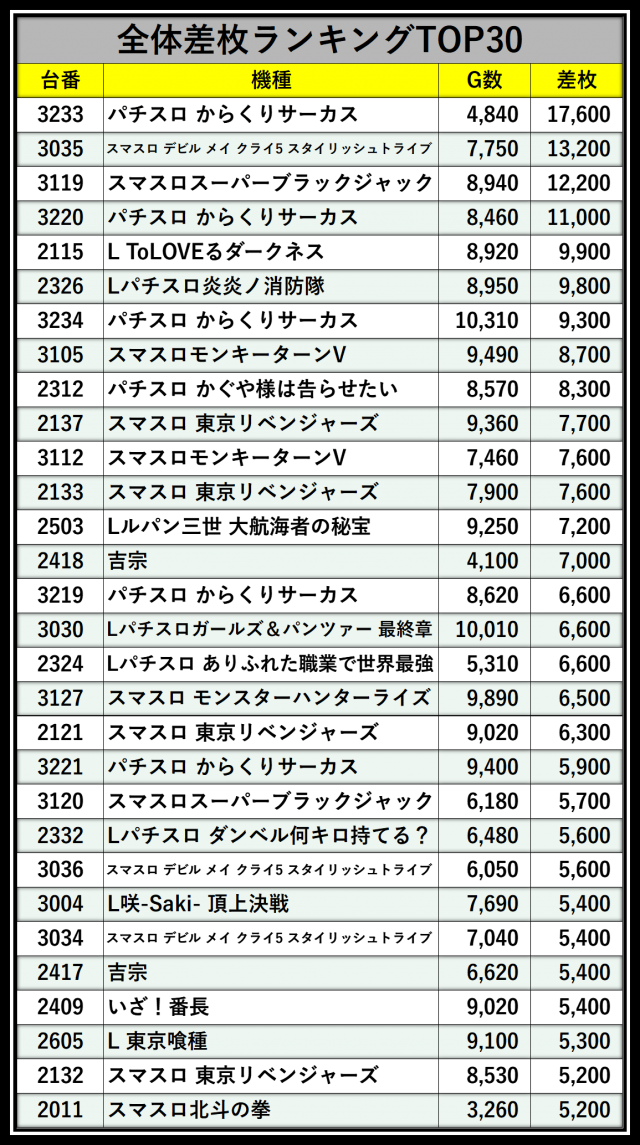 ※差枚数順に掲載しています