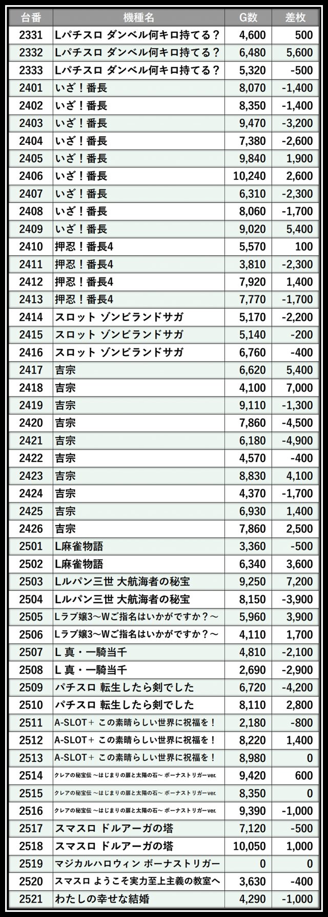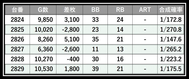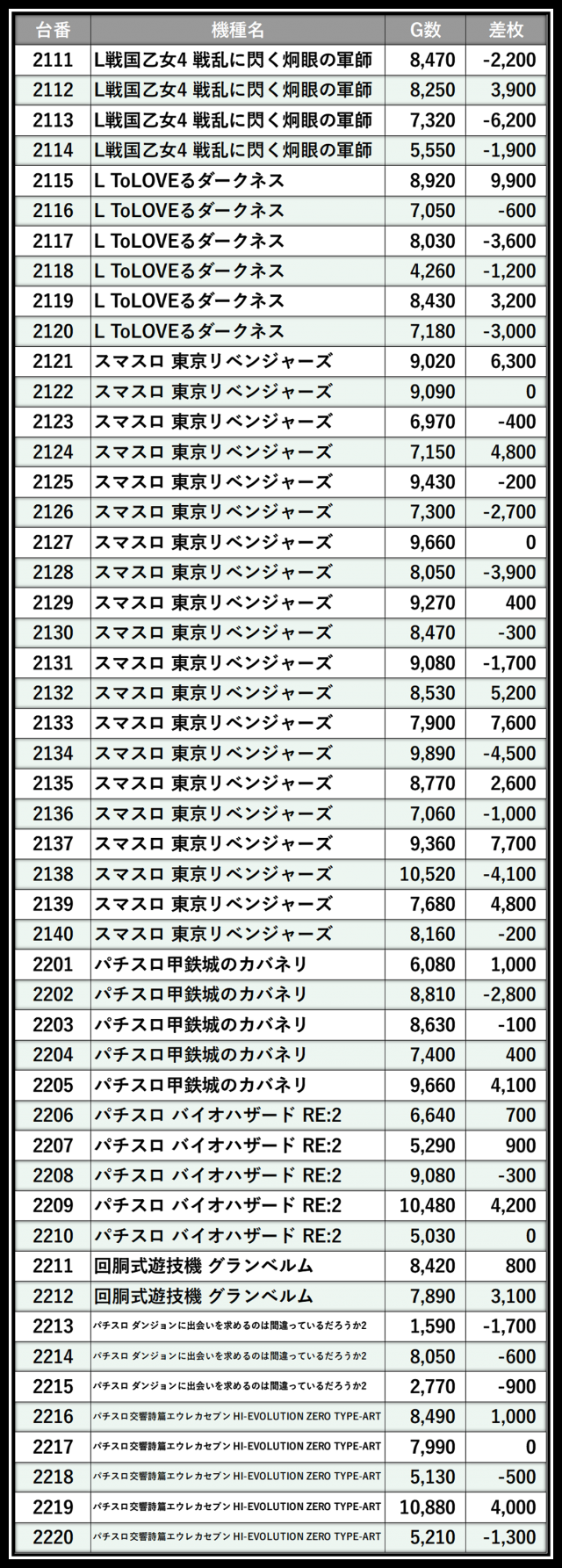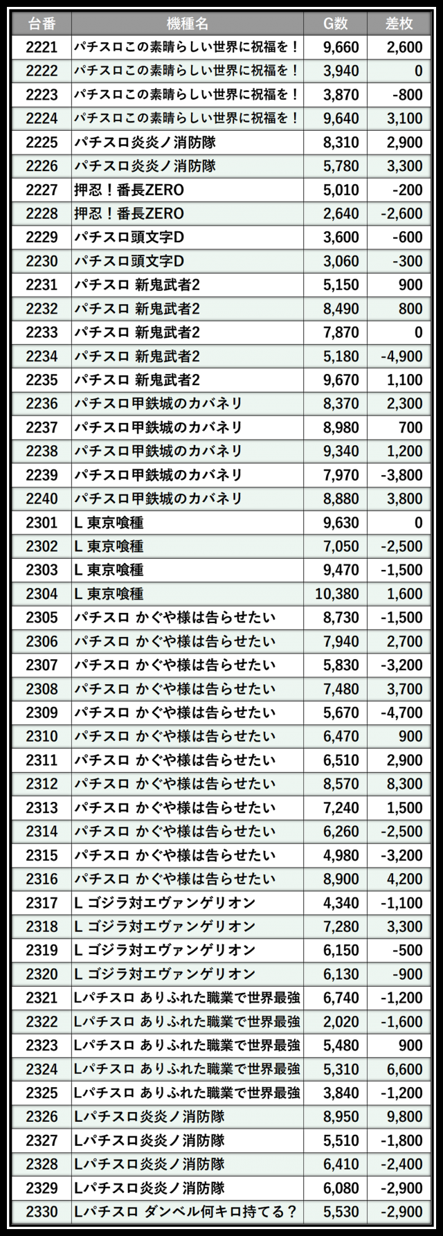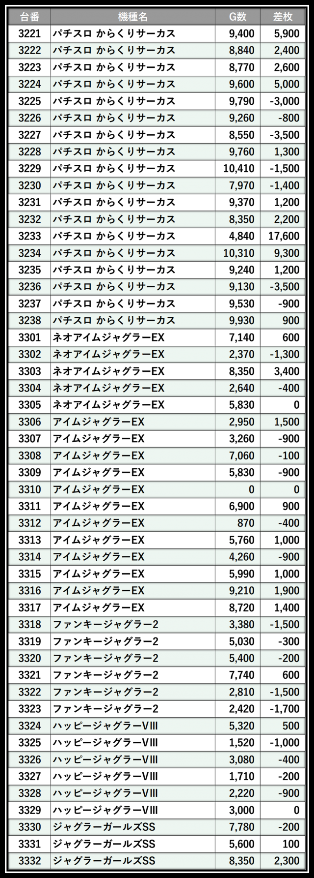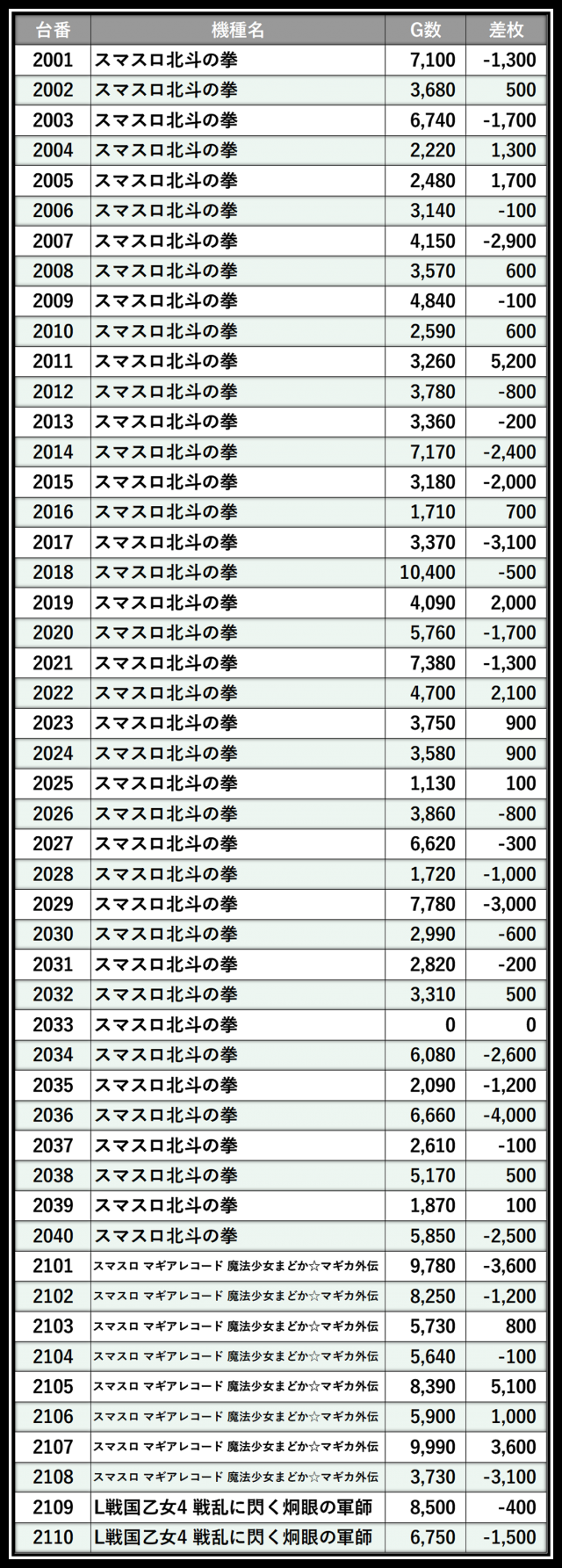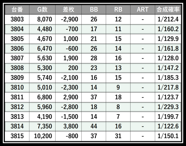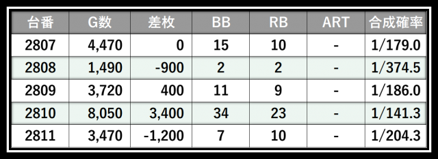※差枚数順に掲載しています