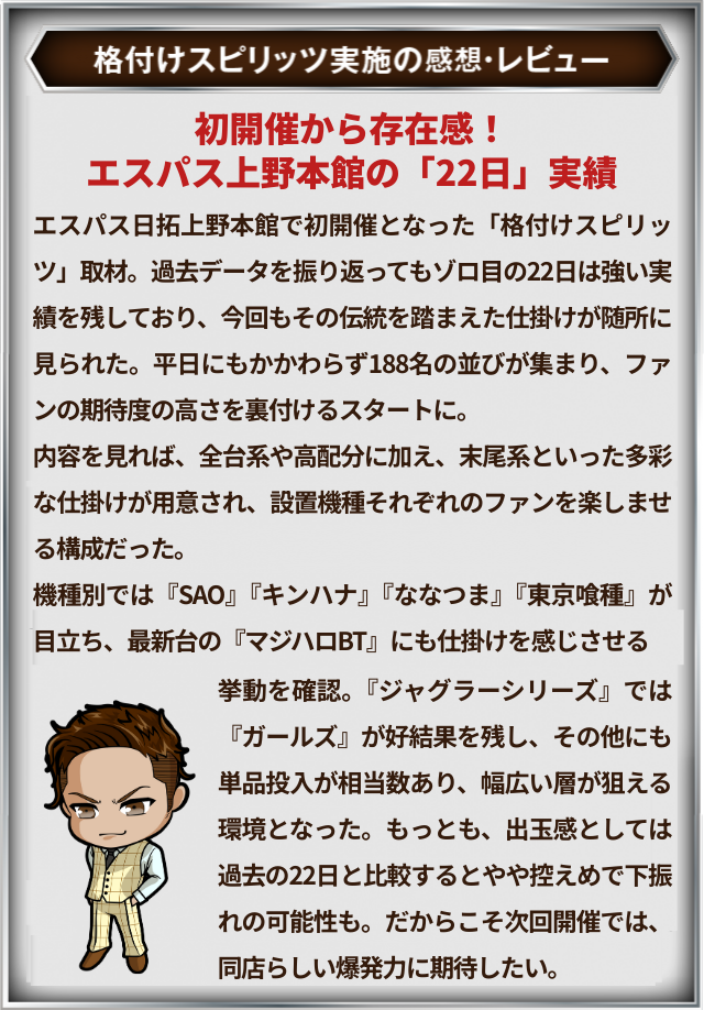 9月22日(月)エスパス日拓上野本館にて、DMMぱちタウンの「格付けスピリッツ」を実施。