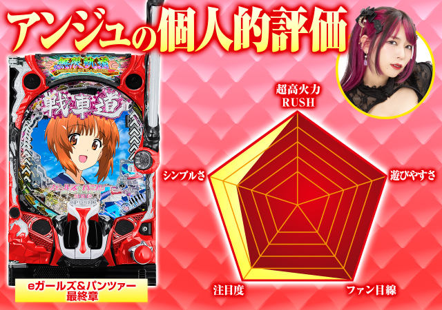 『ガルパン最終章』、いかがでしたか? 大火力のLT3.0プラスと、親しみやすさのライトミドル。 その良いとこどりがこの台の魅力ですね! 最後に、いつものレーダーチャートで、本機の要素をまとめてみましたのでご覧ください。