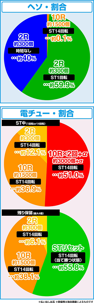 LT・戦車道RUSHはトータル連チャン率が約80%で、出玉が300or1500or3000個+α。ST中と残り保留で大当りの内訳が異なるのが特徴です。ST14回転中は大当りの約51.0%が無限軌道、残り保留では約55.8%が無限軌道の代わりにSTリセットとなります。