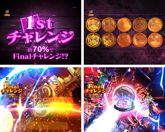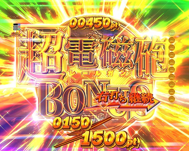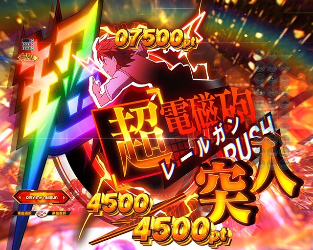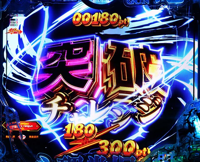 通常時に1/169.7の大当りを射止めると、その終了後に本機独自の突破チャレンジに挑み、成功すればLT・超 超電磁砲(レールガン)RUSHが発動。その突破率は約25%となる。