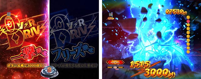 そしてRUSH中大当りは、開始時のギミック落下でOVER DRIVEなる出玉増加の特化ゾーンに突入。成功により出玉3000個以上が濃厚となり、一撃7500個獲得やそれをも上回る出玉も夢ではない。