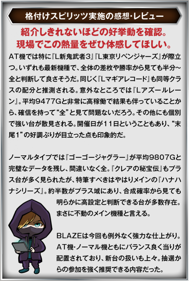 10月11日(土) MEGAコンコルド1111BLAZE店にて、DMMぱちタウンの「格付けスピリッツ」を実施。